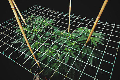 ScrOG: Dies beinhaltet ein Gittergeflecht mit ausreichend großen Maschen, durch die Du Cannabisblätter und -stiele führst. Dieses kann aus einem handelsüblichen Zaundraht oder Plastikgitter angefertigt oder aus an einem Rahmen angebrachten Drähten oder Schnüren gemacht werden. Der Zweck des Gitters ist, neuen Wuchs kontinuierlich darunter zu klemmen, um ein flaches Blätterdach zu erreichen. Was unterentwickelte Seitenzweige mit kaum ausgebildeten Buds geworden wären, werden nun gesunde, kräftige Zweige mit reichlich Lichteinwirkung und ihren eigenen dichten Blüten.